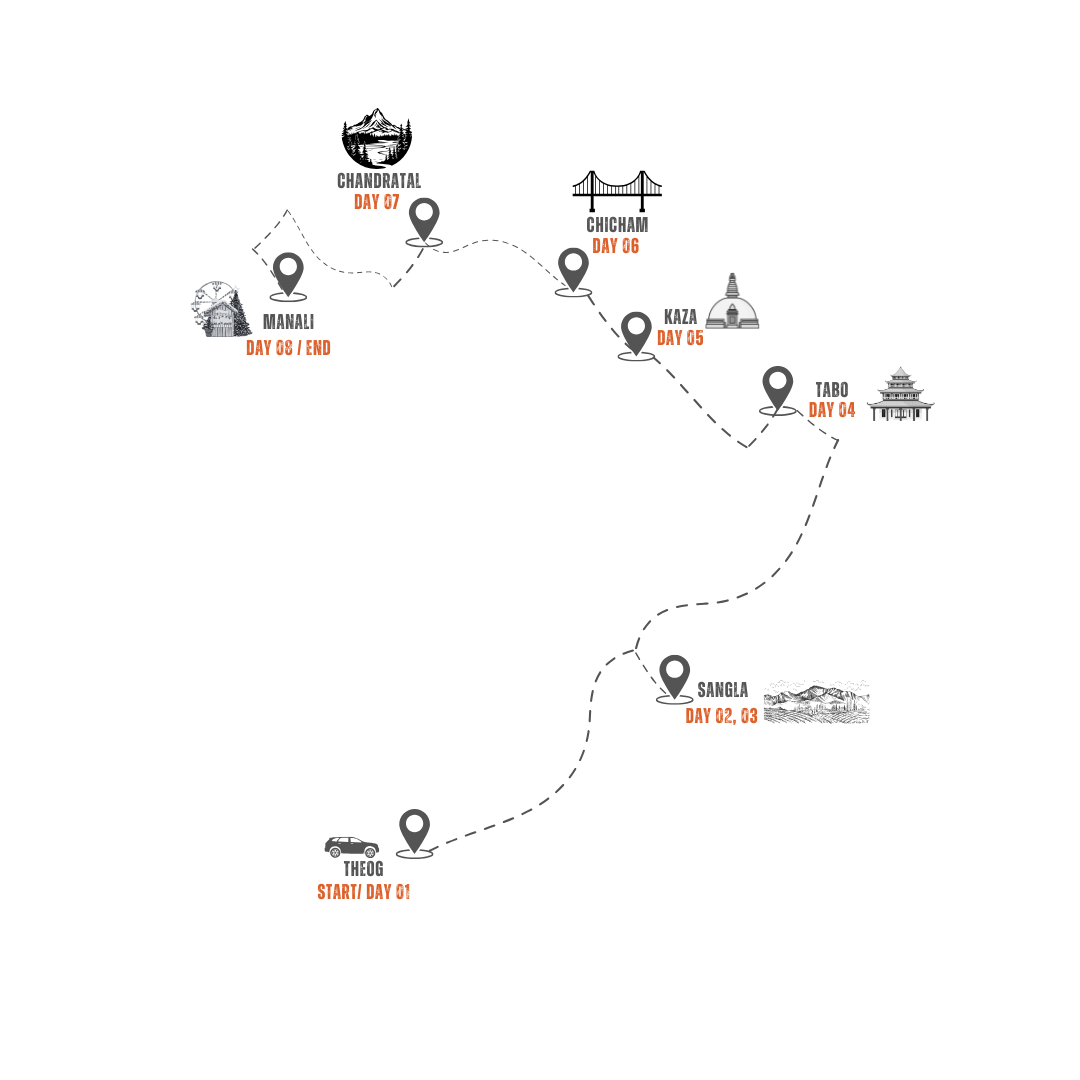 Kick things off in Theog, where rolling hills give way to the secret gem that is Sangla—think hidden valleys, epic peaks and total peace. Next, you’ll hit Tabo, home to ancient monasteries that make you feel like you've stepped back in time.